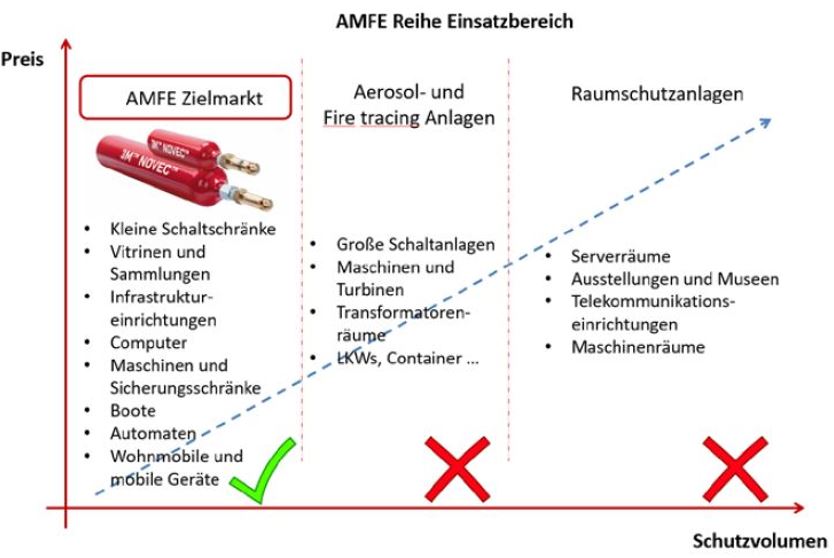 Typische Anwendungsbereiche der AMFE sind jedoch kleine, abgeschlossene Gehäuse und Geräte, welche durch ihre geringe Größe und Einbaulage während des normalen Betriebes nicht zugänglich sind. Denn kleinere Maschinen werden regelmäßig nur passiv über Rauchmelder und Sprinkleranlagen geschützt – ohne aktive Brandlöschung im Fehlerfall. Exakt dort leistet die AMFE Abhilfe!